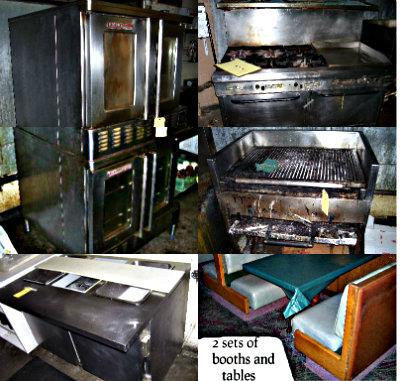 restaurant..chairs tables, cooler, stoves, oven.