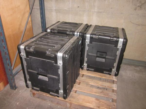 Items are road cases with casters and are stackable.