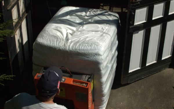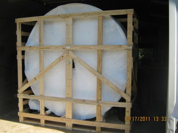 Easy load and unload. Takes only 10' of flat bed deck space with fork load and unload with a business pickup and delivery. I ship this size water wheel several times a year on car carriers and flatbeds so this is an easy way to fill out a load. 24 hour notice before picking up required so I can have the forklift onsite. Pickup can be made 7 days a week 8am to 7pm. Picture is of the same size crated water wheel before shipping.