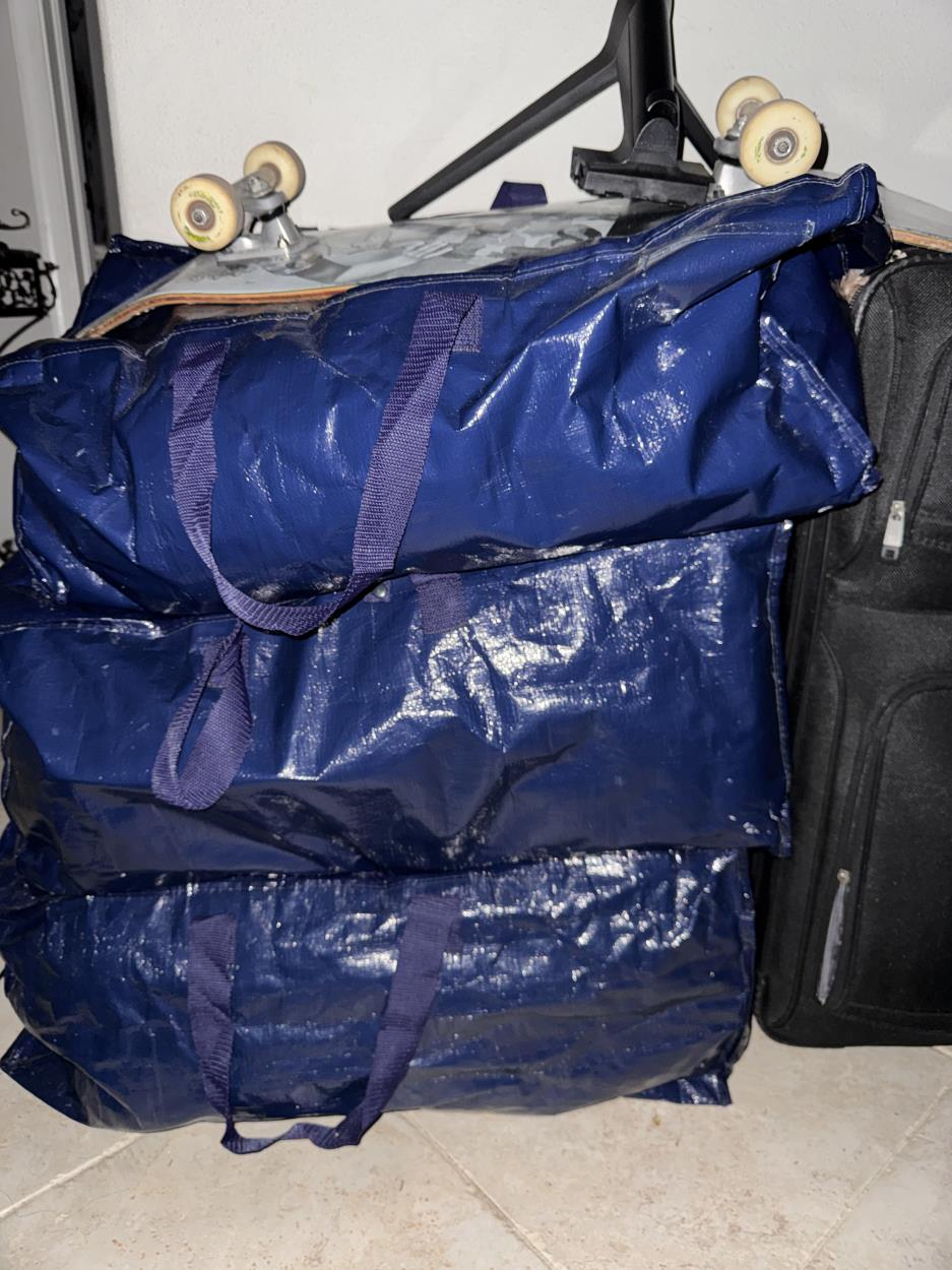 I also have a plastic folding table. Its more stuff than I can take on a flight but not enough for a uhaul.. pictures soon. But ten of the blue moving bags sold on amazon... with handles, not actual boxes
