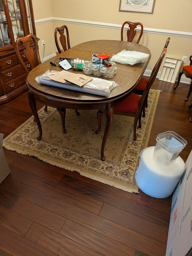 Dining room includes china cabinet,table, 6 chairs, buffet cabinet, 2 table leaves, table pads