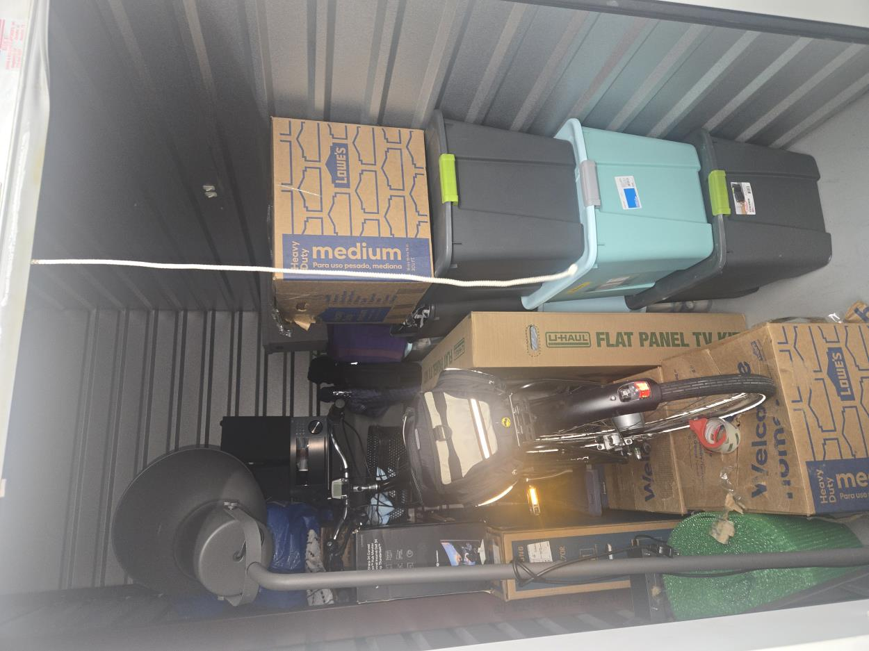 Storage unit contents. About 10 medium boxes / pladtoc totes. One large plastic tote. 1 large tv sized box. 1 large 65" inch tv in box. 1 computer monitor in box. 1 IKEA floor lamp. 1 E-Bike. 2 large speakers. Large Subwoofer, 3 medium speakers. A/V Receiver. Standing desk disassembled into 60x30 table top and legs. 1 zero gravity chair. 1 small file cabinet. A couple smaller boxes and IKEA bags of clothes. All stacked together it is probably less than 150 cubic feet. The storage unit is 5x10 as a reference from the photo. I think there a couple more items on top now than the photo shows but not a lot.