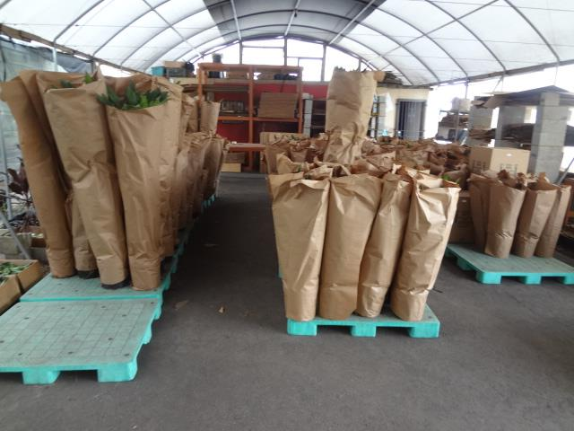 Hay is stored in a barn. A truck can be driven next to the barn doors. The driver will need to take the hay from the barn and stack it in his box trailer. The individual bales weigh about 35 to 40 lbs. each. About 500 bales will make a load.