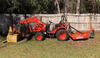 We can use the tractor loader to stack the box blade and rake onto the trailer first and then drive the tractor onto the trailer with mower attached, as shown in the pics. This will keep the weight forward on the trailer and keeps total length just under 21’.