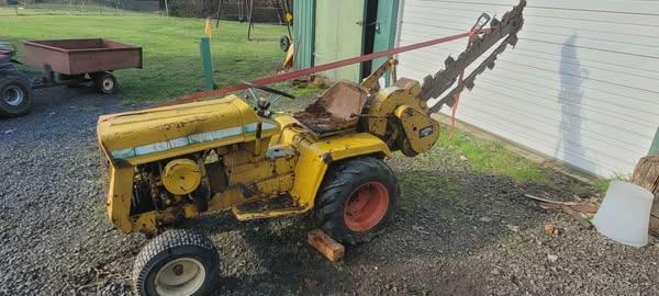 Lawn mower tractor with a 3' bar trencher attachment. Rolls. Loading help with onsite tractor at both pickup and drop off locations