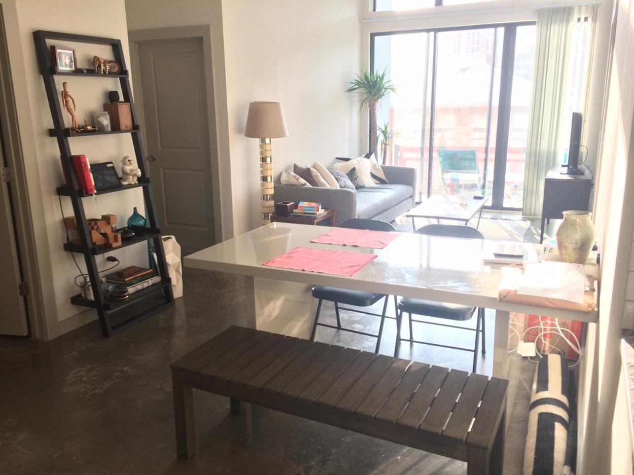 Apartment is at the end of the hallway on the 4th floor with an elevator. Goods are staged in one room.
