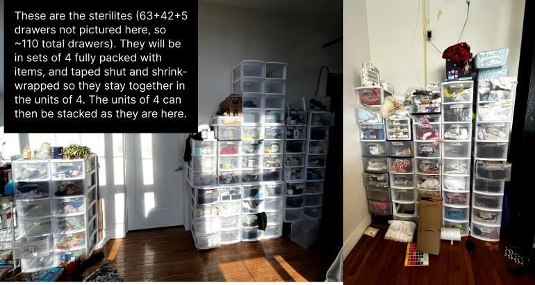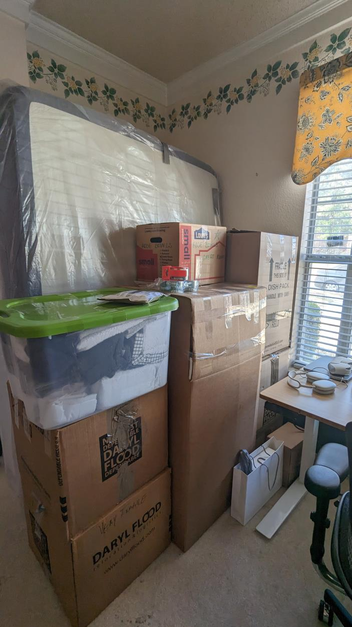 I had to relist this, because our moving date changed. Pickup has a freight elevator, but also a quarter of a flight of stairs in the lobby. No bed frames—just the mattresses (2queen,1twin,1futon). 1 very large wood-top folding table. 1 Large TV (65”?), and small portable tv stand. 1 bicycle. 1 guitar. 1 ladder. 1 normal vacuum. 1 large baby gate tied together with rope. 1 folding privacy screen (folds flat). 1 shopvac (in a box). There are about 30 plastic 4-drawer sterilites (14 1/2" x 12 5/8" x 31" each) that will be full and shrink wrapped, which I’m counting as 30 medium boxes in the inventory. 8 large moving totes (30"L x 16"W x 15"H), which I’m counting as 8 large boxes in the inventory. About 10 small book boxes. And probably about 10 additional boxes ranging in size from small to large. Some of the boxes will have live house plants in them and be labeled “fragile”. We are somewhat flexible in the move dates, but prefer no more than 3 days between pickup and dropoff because of the live house plants. Must be picked up no later than February 13, and dropped off no earlier than February 15.