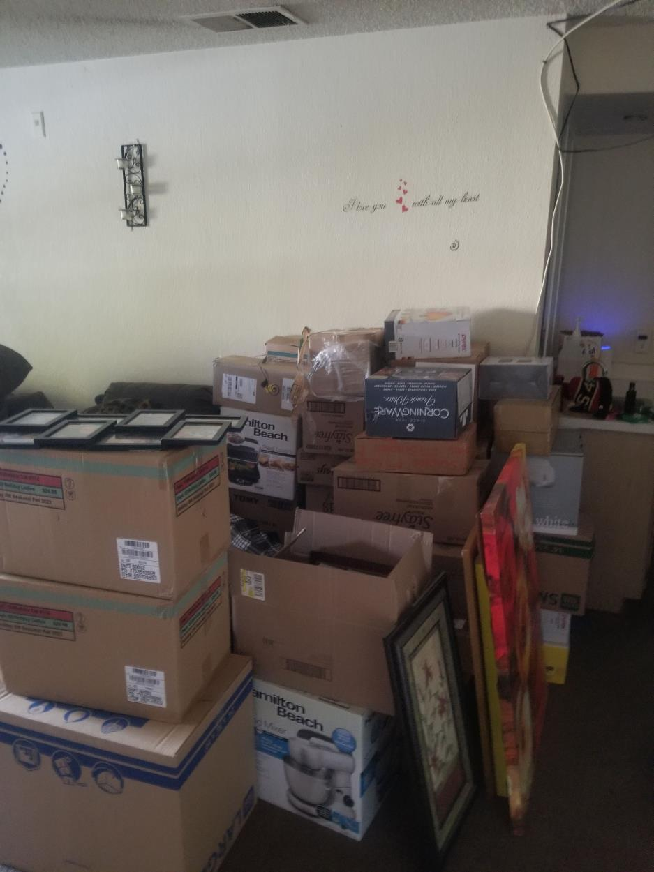 Two bedroom apartment, no large appliances. Two king-size beds with mattresses, headboards and small footboards, 4 nightstands, 4 dining chairs, one dresser, one chest, small entertainment center, coffee table, 4 stools, Peloton bicycle, boxes of clothes, shoes, dishes and kitchen items (nothing large), small rugs and bathmats, couch, bicycles, picture frames and small wall art. Two televisions.