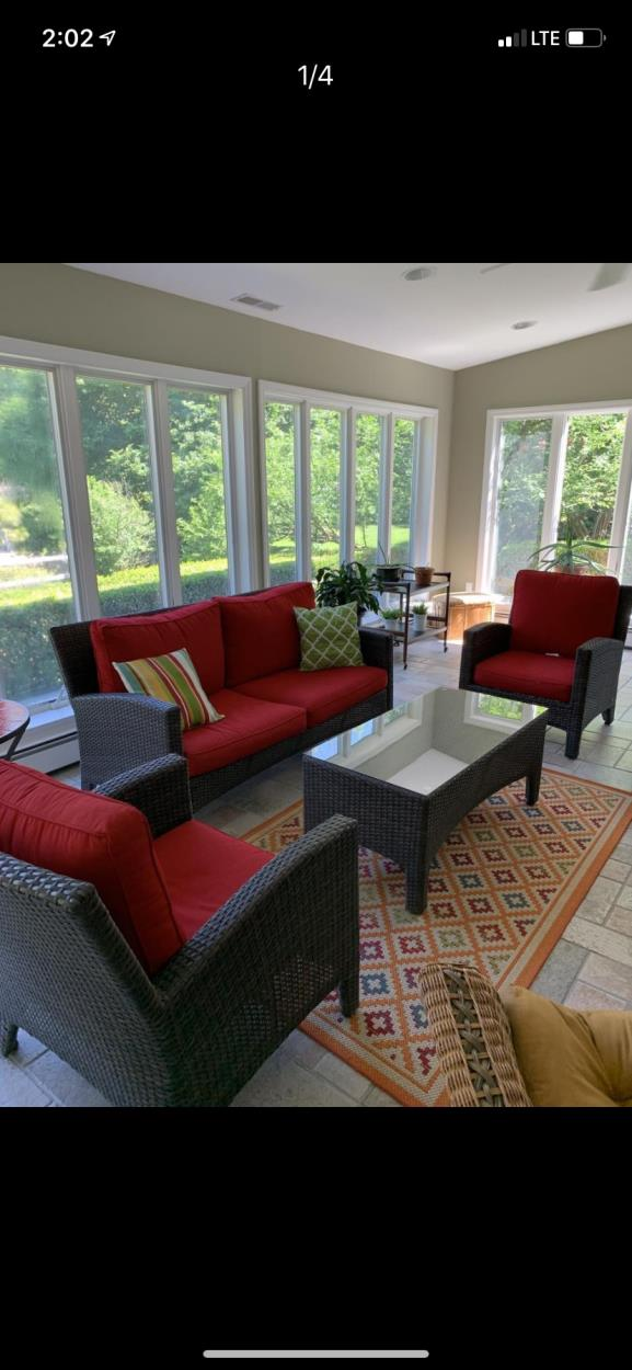 Outdoor patio set (loveseat, 2 chairs, table, cushions)