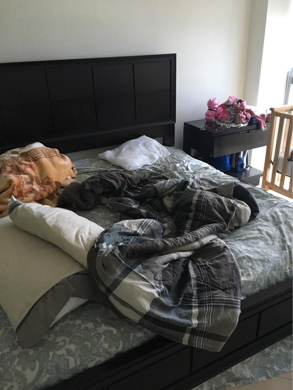 There will be California king size bed on first fl, one sofa on second floor (stairs), 2 armoires on 3rd fl (stairs), small TV, kitchen table used as computer desk on 3fl (stairs), computer, probably 12 small, medium and wardrobe sized boxes. 2 rugs