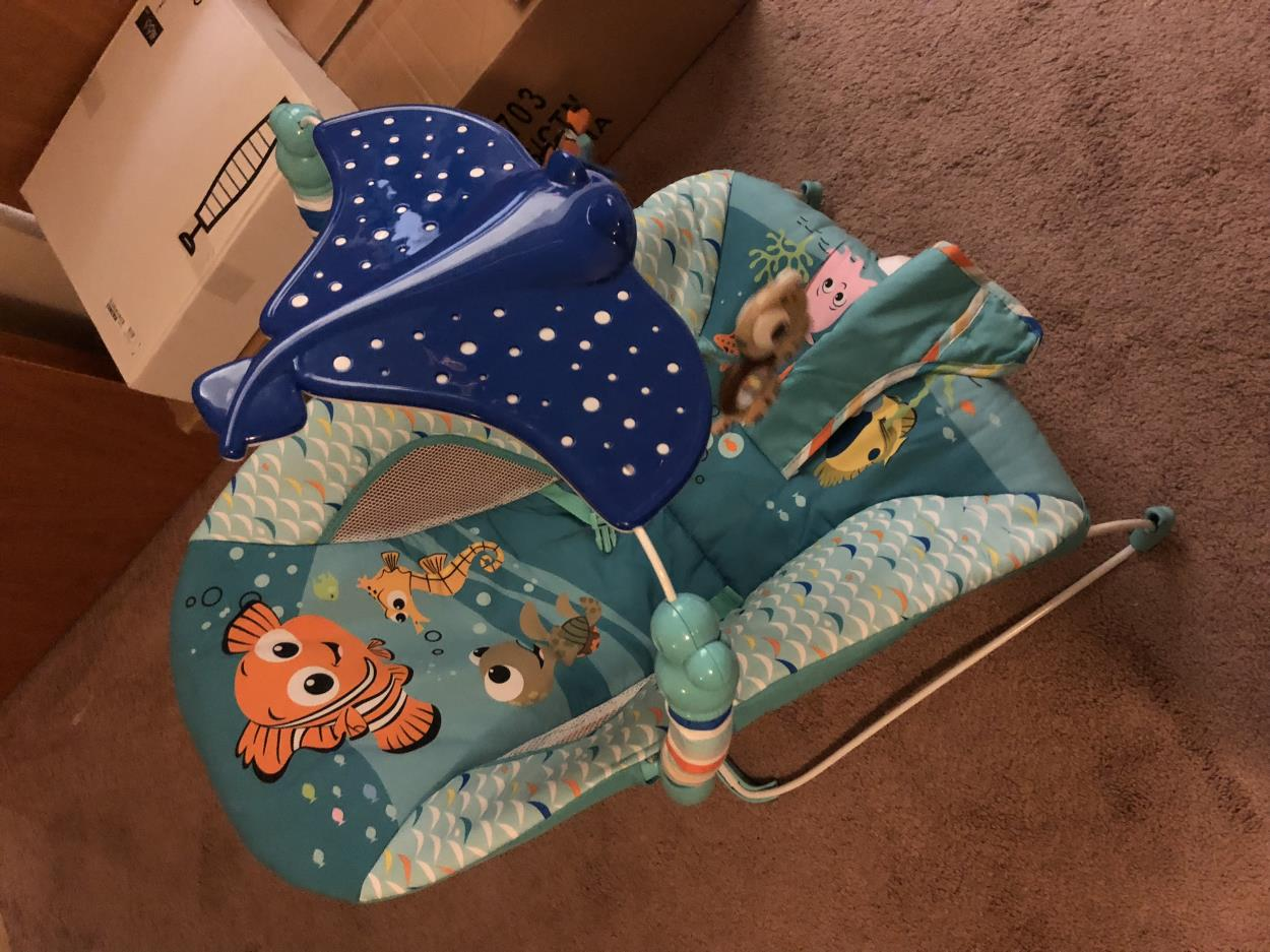 Small travel-size baby swing, bassinet (marked as cradle), small baby bouncer