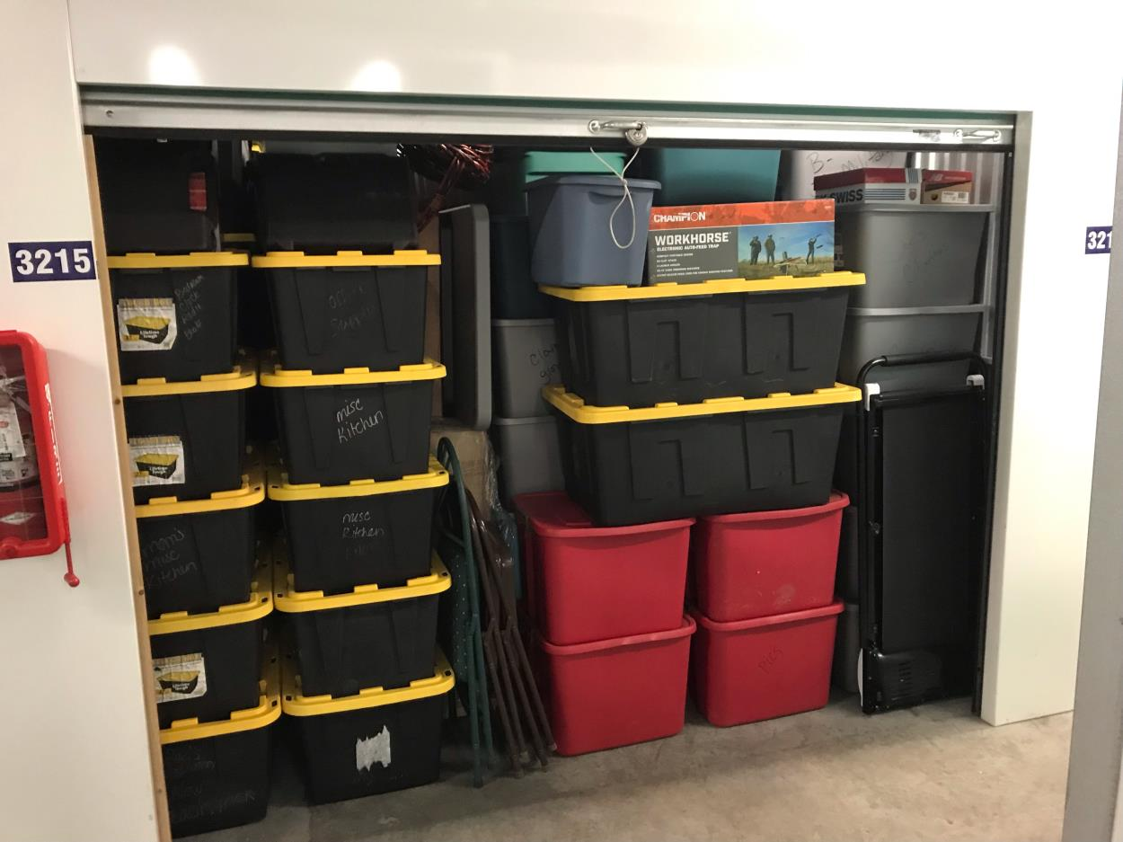 (4) 10x10 storage units with household items. Items include washer and dryer, freezer, refrigerator, 2 x twin mattress and box spring, everything else is mostly Rubbermaid storage tubs and totes. Card board boxes are uniform size as well.