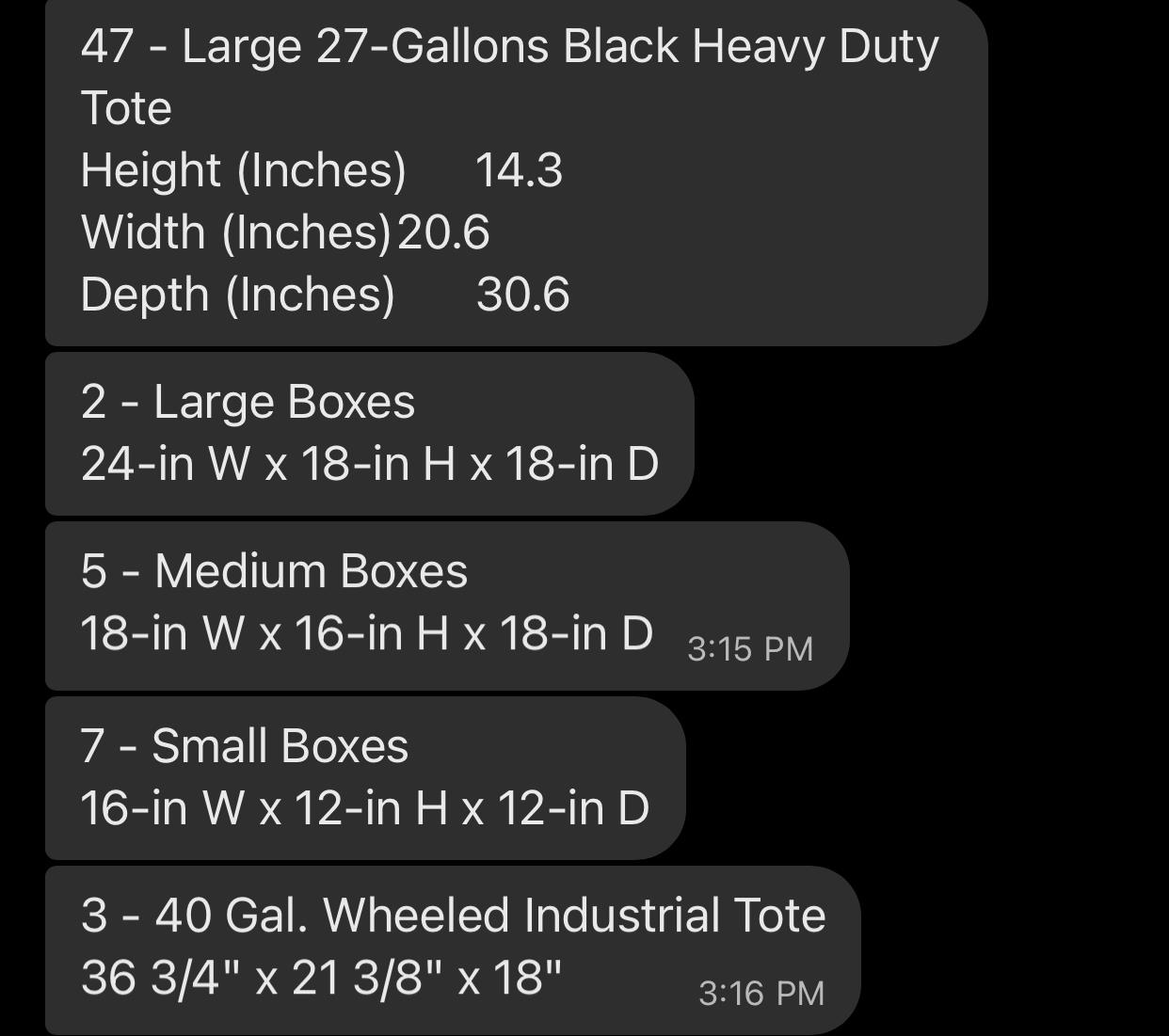 was told I have about 800 cubic feet of stuff. Not 3 bedrooms full of furniture, one has a treadmill in it and a large mirror, the other is just a desk/tv/a few boxes. Master bedroom has just a queen bed and frame and boxes and clothes/shoes, no dressers. Family room is just boxes and TV not the sectional sofa. Lamps/knick knacks etc in boxes, books, pictures. Kitchen is usual stuff, boxes plus large granite table top and base and a sectional seating group. Large mirror, decor and more boxes. Basement has lots of large plastic storage containers full of pictures, books, pillows, linens, clothes, shoes, decor, small appliances. No garage. Only a few outdoor yard tools plus a leafblower, edge trimmer, a small electric bbq smoker and MAYBE outdoor seating set, large glass table with 8 chairs. May sell that if I'm lucky, if not have to bring it. Thank you