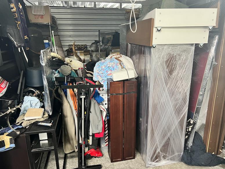 Items accounted for: Buffet, China Hutch, Dresser, 4x5 framed flag, 2x garage silver storage shelf, standing desk, Queen Mattress, Q Bed Frame, and under bed drawers 4x, Night Stand and lamp, Tall Lamp 2x, kitchen cart, 42" tv, tv stand, round outdoor table, desk chair, 2x Longhorns, Christmas tree, 12 plastic tubs and 8 boxes already packed, Full Body Mirror, Desk Stool, 10 Items of clothing - video of storage unit available on request