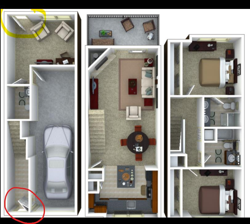 Yellow Circle - bottom floor access to main street. Red Circle front door access to interior of complex. Both staircases narrow. May require extra carry out front door, back through garage, to main street access. Pictures included. I have seen large trucks in the interior, but it was ugly. Most items packed from previous move/storage. Including more photos of items shortly. Big Move company approximated 6600 Pounds by visual.