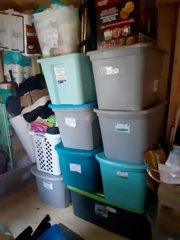 Roughly 20-25 boxes ranging from sizes small to large. Half the boxes are cardboard, while the other half are inside of clear bins.
