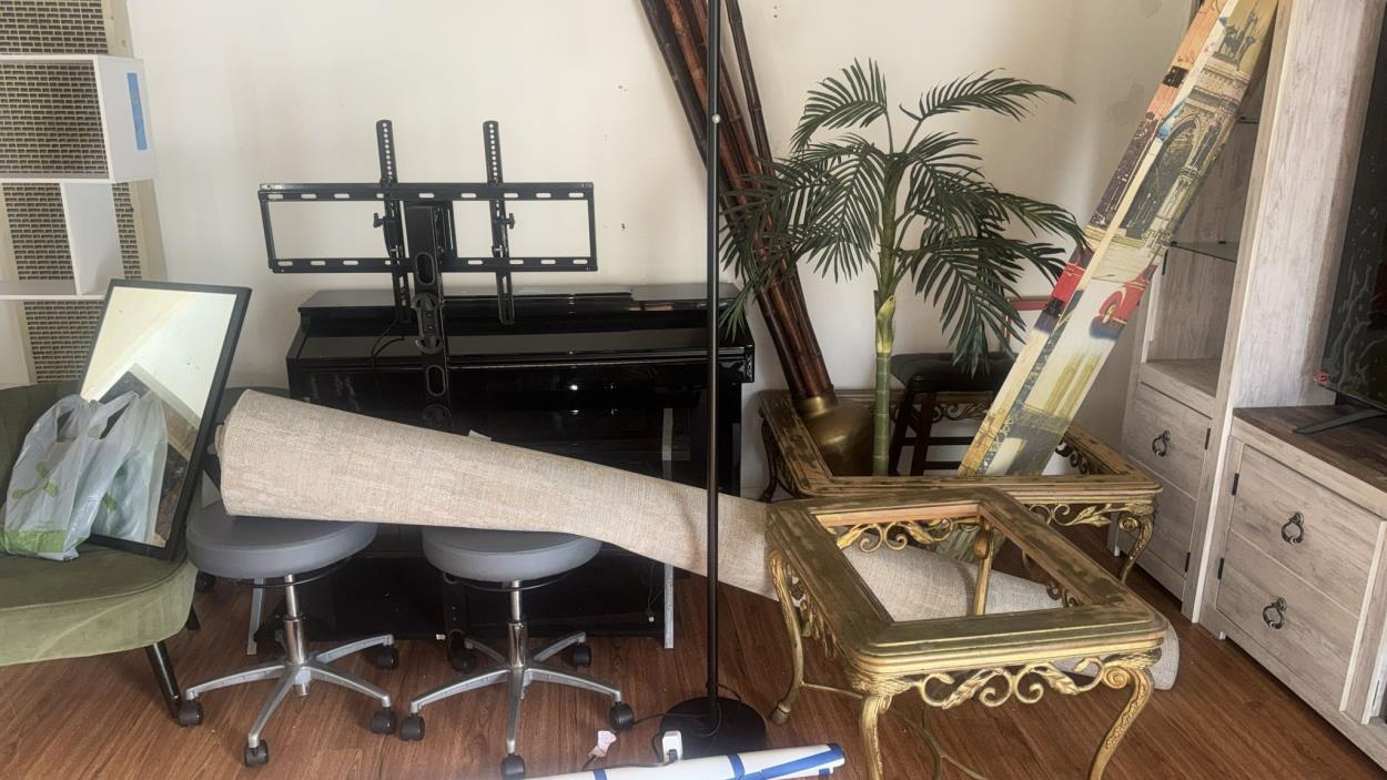 with the exception of one chair, most furniture wrapped in moving blankets + plastic wrap