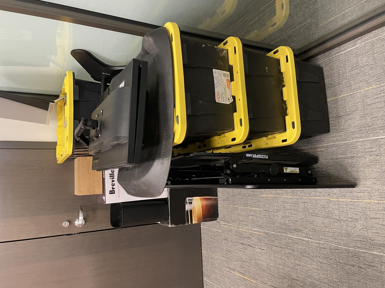 9 storage boxes, 1 office chair, 3 computer monitors w/ stands, 1 standing desk (converter, not a full desk), 3 small misc items. All items are inside an office building. Would need to be picked up Mon-Fri business hours.