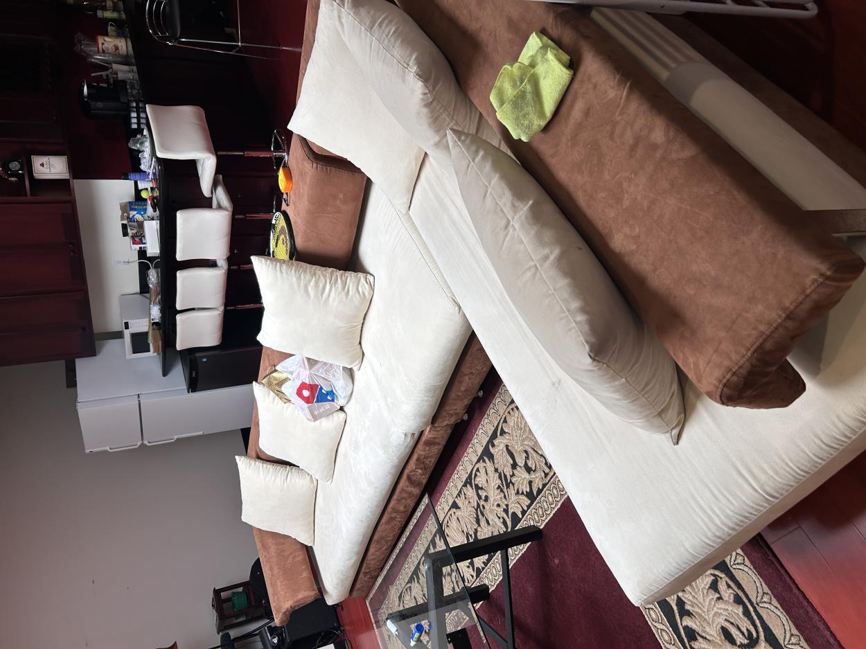 1 L shape sofa set (stackable) 4 sofa arm chairs (36”x36”) 3 book shelves (without book 75” c 36”) 1 coffee table , 1 end table, 1 tv stands 1 refrigerator, 5 moving median boxes(20x16)