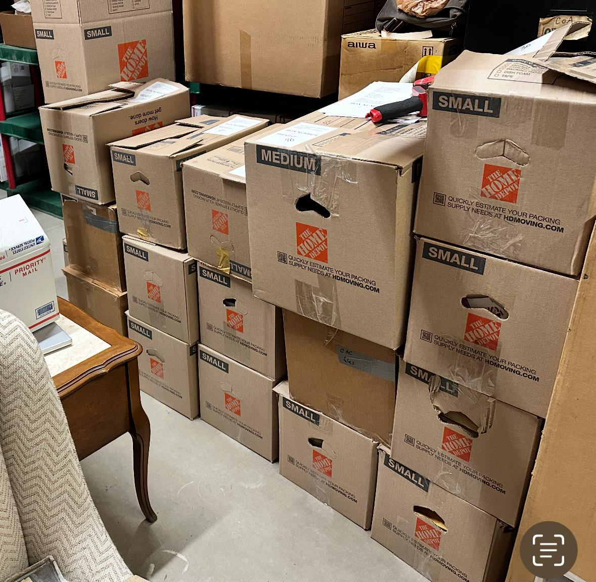 These boxes are in an interior basement of a single family house (no exterior door to the basement). The interior first-floor staircase down to the basement is about 15-20 steps. The steps to the front door of the house (for box removal) are about 10 (5 to each landing of the front outdoor garden). Or, if exiting the boxes from the back of the house, there are only three steps, which lead up to an alley way. There is a dedicated, off street parking pad for this residence there that can accommodate 3 passenger vehicles.