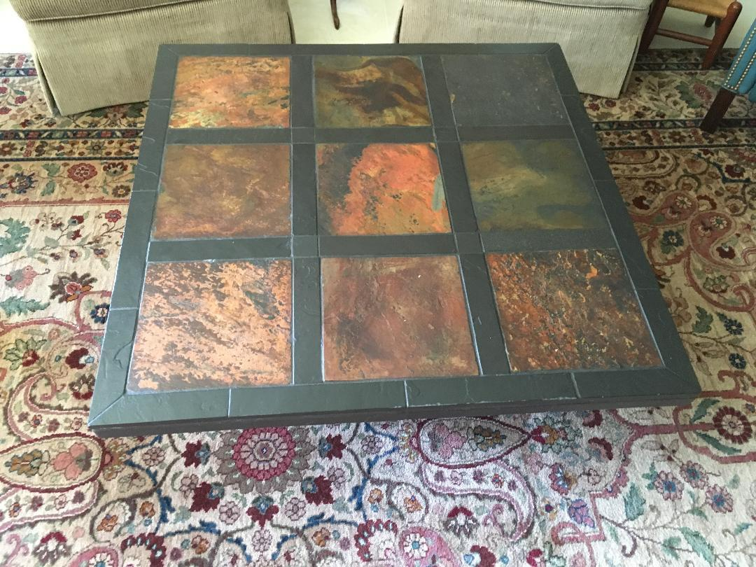 slate coffee table, 2 occasional chairs, leather office chair, dropleaf table rolled Persian rug, humidifier, floor lamp, a couple paintings boxed, 2 book boxes