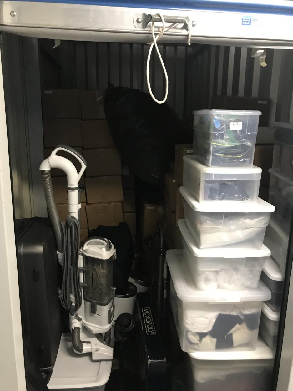 Unit includes several small 6x6x6" packed packages, queen size mattress, vacuum, luggage, and other miscellaneous home items.