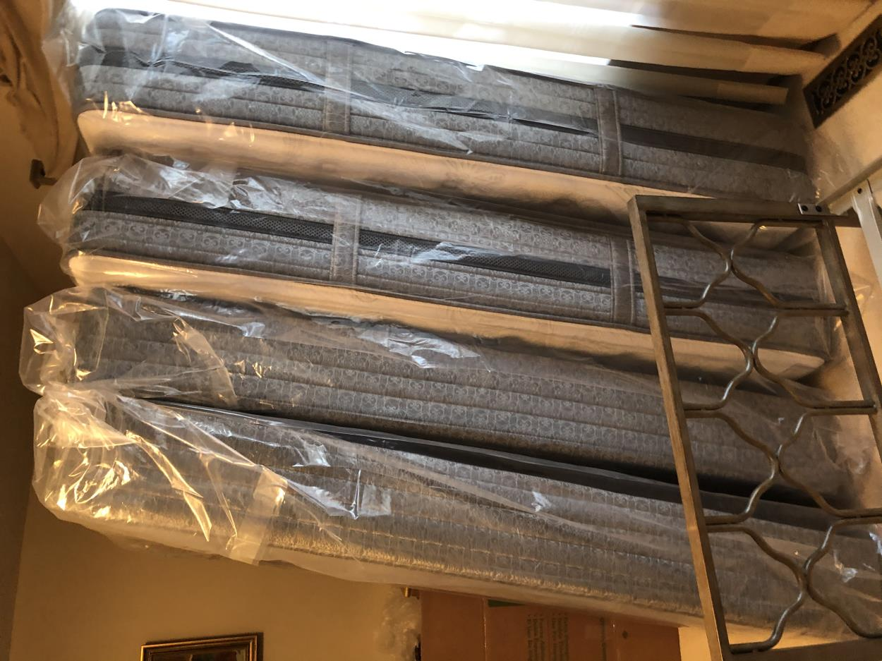 42” flatscreen yet to be boxed. Two twin mattresses and box springs. Vacuum SIX large boxes see dimension photo. Two bar chairs. Outdoor wicker loveseat and coffee table