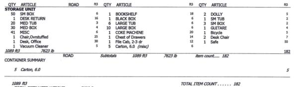 All items are in a storage unit 10'x15'x8'. The unit is full. There is a 700 pound safe on a moving dolly and a few loose items that will require boxing (estimate 8 large boxes. There is a med size stand up freezer and med size coke machine. The storage unit is a hallway unit in an gated facility. As a point of clarification, the storage unit is on the ground floor. The destination is an apartment complex with an elevator. I've included a screenshot of the inventory compiled by another mover with the estimated weight.