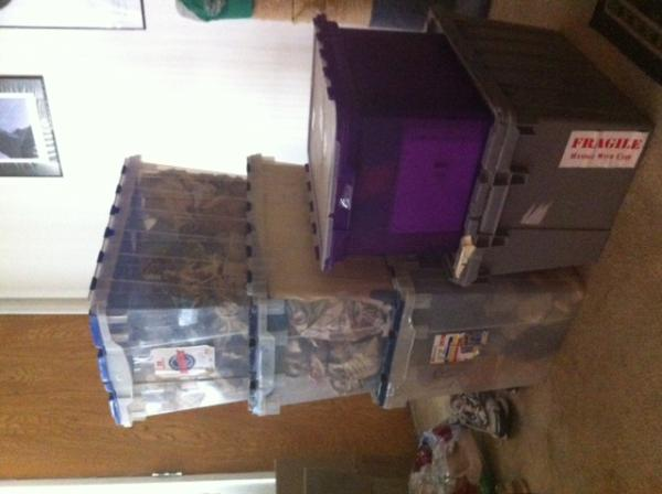 Posted pic of a few of the totes so you can see sizes, 3 or 4 will have books and weigh 35-40 lbs, the rest have household items and weigh up to 20lbs. Additional items: 1 oil heater, deflated twin air mattress, 2 blankets, small suitcase, duffel bag of clothes, 1 painting 22x30 pre-wrapped in protective bubble & cardboard. The aquarium is 24x13x13. Pickup location is a first floor apt. with street parking. Most folks just double park the moving van, we've had full size semis on the street. Loading should only take 20-30 min. at most since there's not much to load. Dropoff is at a residential house, wide cul de sac street in a rural area but only 10 min. off the highway. The items will need to go down to a basement level if possible, so one flight of stairs.