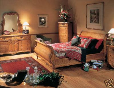 Qn Sleigh Bed is already disassembled & has a head board, footboard, 2 oak frame rails & 3 metal center supports. And the solid oak dresser.