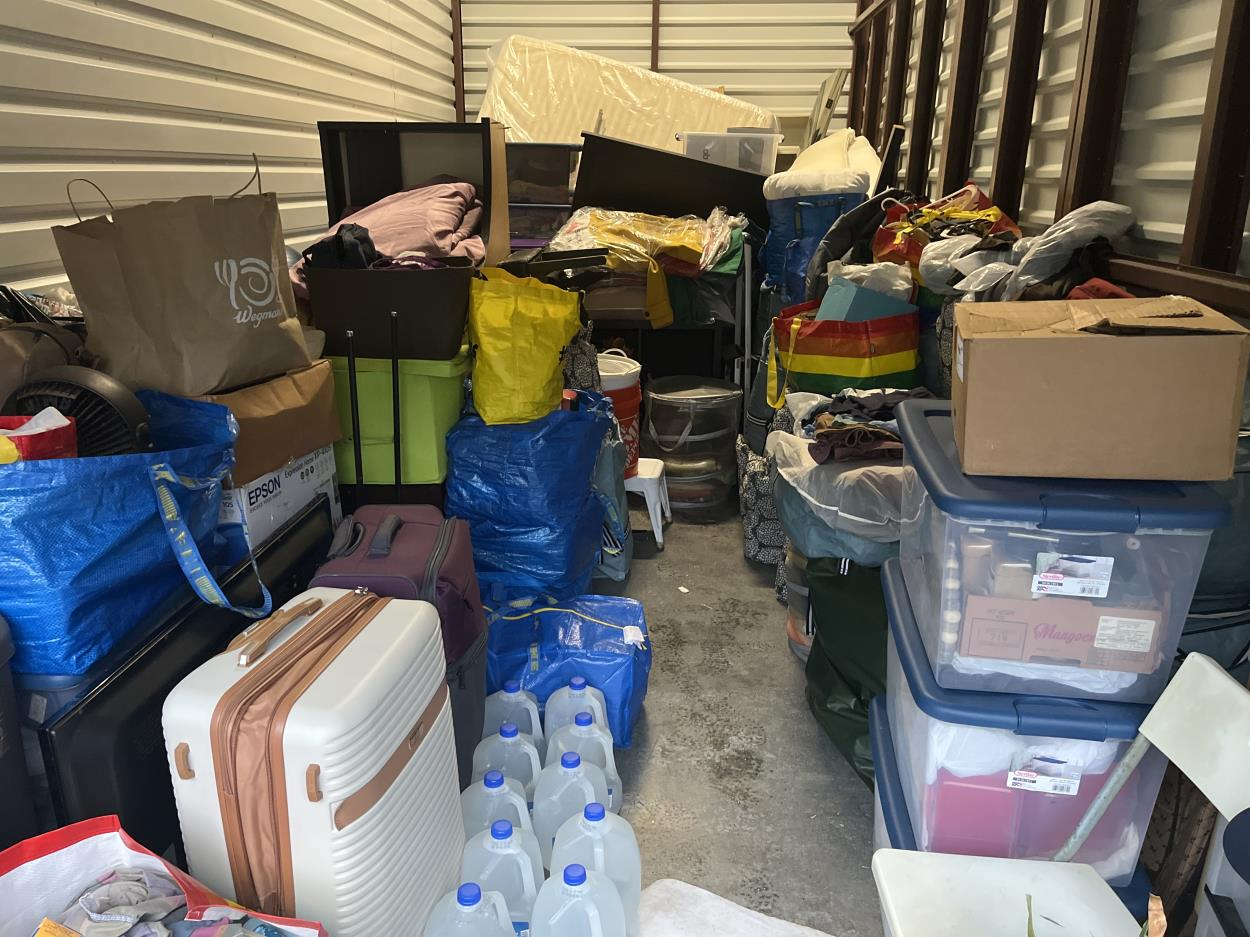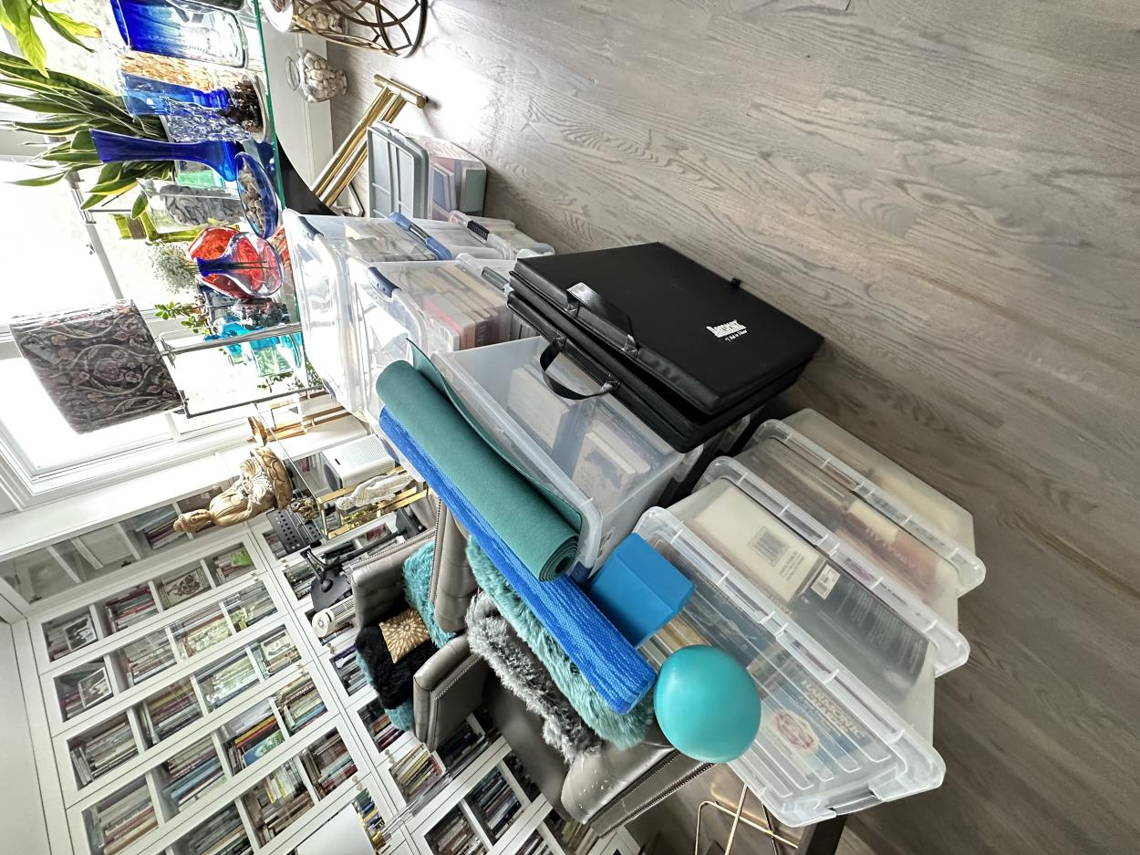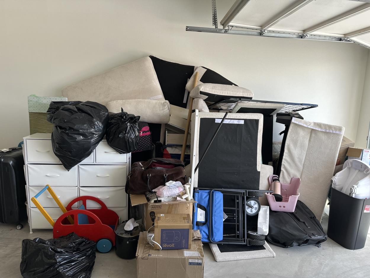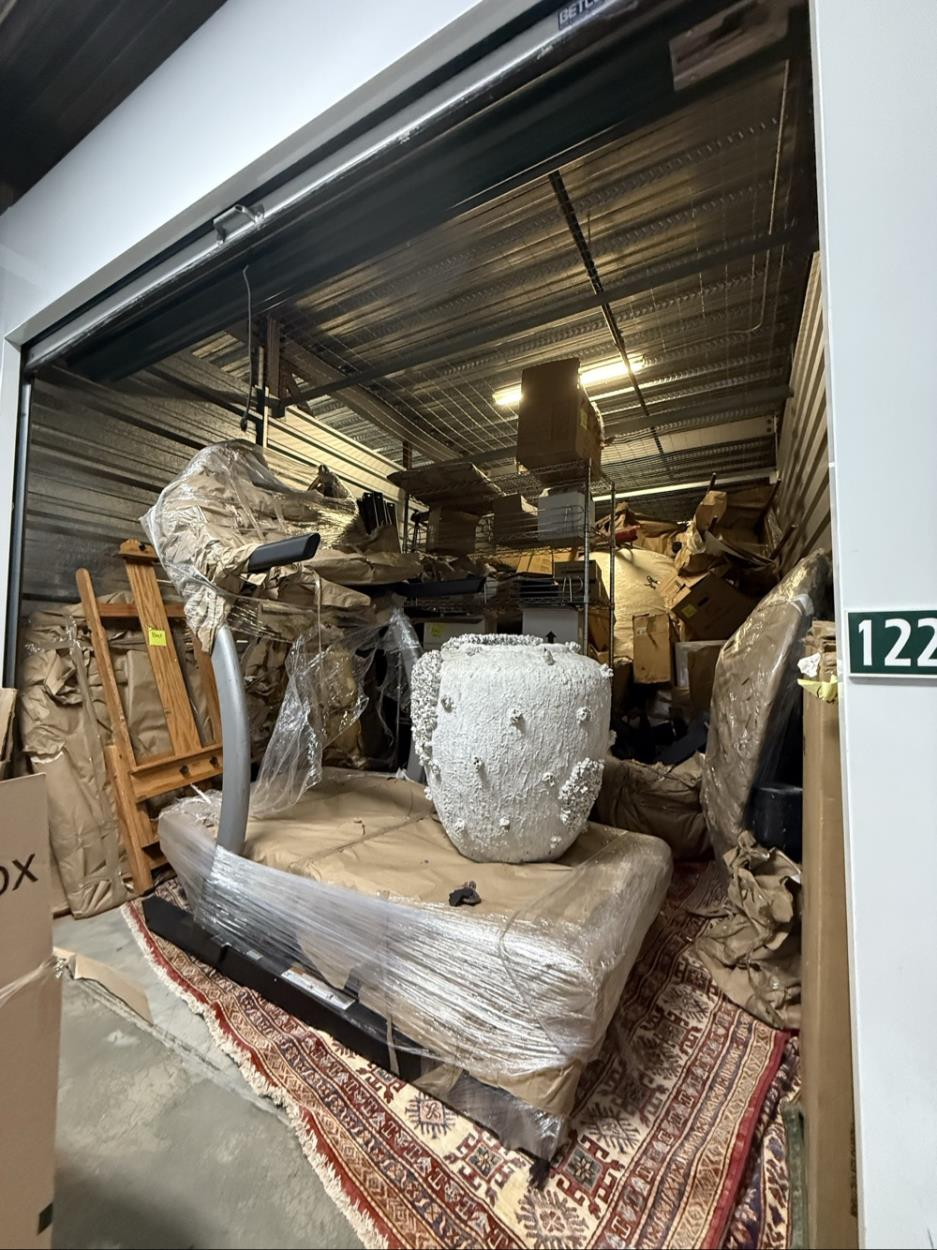 Items include mattresses, heavy workout equipment, furniture, décor, and numerous boxes.