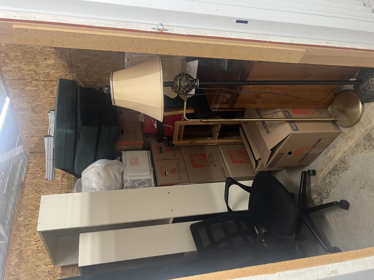 This is a ground level storage unit with drive up access. Unit is not full and consists of a sectional sofa, 2 outdoor wicker benches, a small outdoor iron table and 3 chairs, some pictures, some outdoor ornaments and a couple small misc items. These are items leftover from our move that did not fit. I used a uhaul trailer that measures 6x12 to transport all of this to the unit and everything fit. Nothing too heavy. Being that this is a drive up unit, it will all load up quickly and easily.