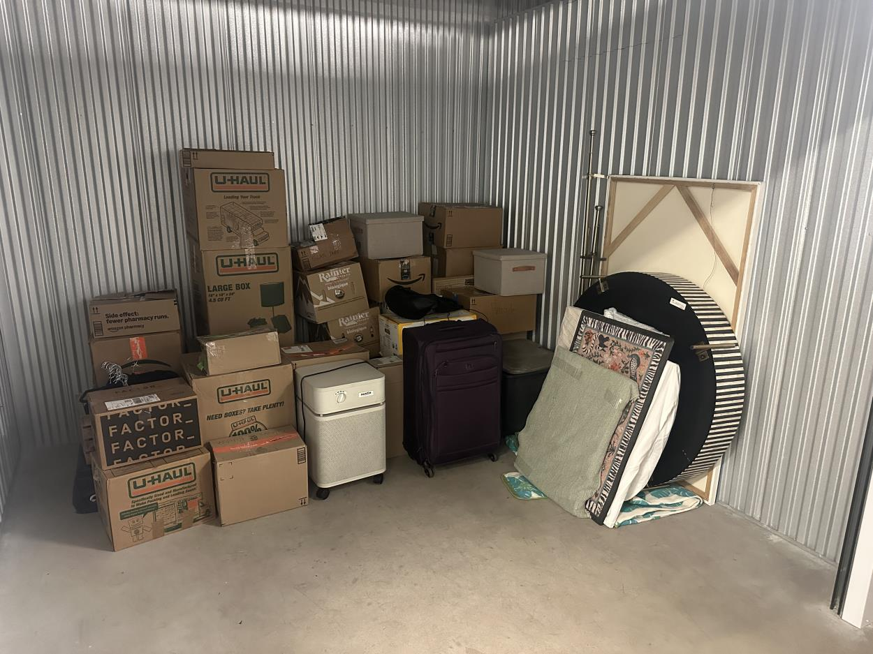 This is a ground level storage unit with drive up access. Unit is not full and consists of a sectional sofa, 2 outdoor wicker benches, a small outdoor iron table and 3 chairs, some pictures, some outdoor ornaments and a couple small misc items. These are items leftover from our move that did not fit. I used a uhaul trailer that measures 6x12 to transport all of this to the unit and everything fit. Nothing too heavy. Being that this is a drive up unit, it will all load up quickly and easily.