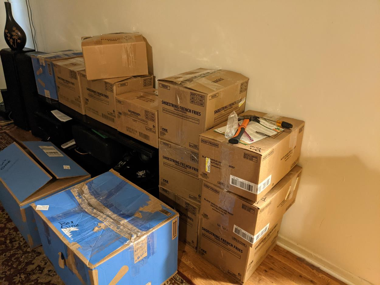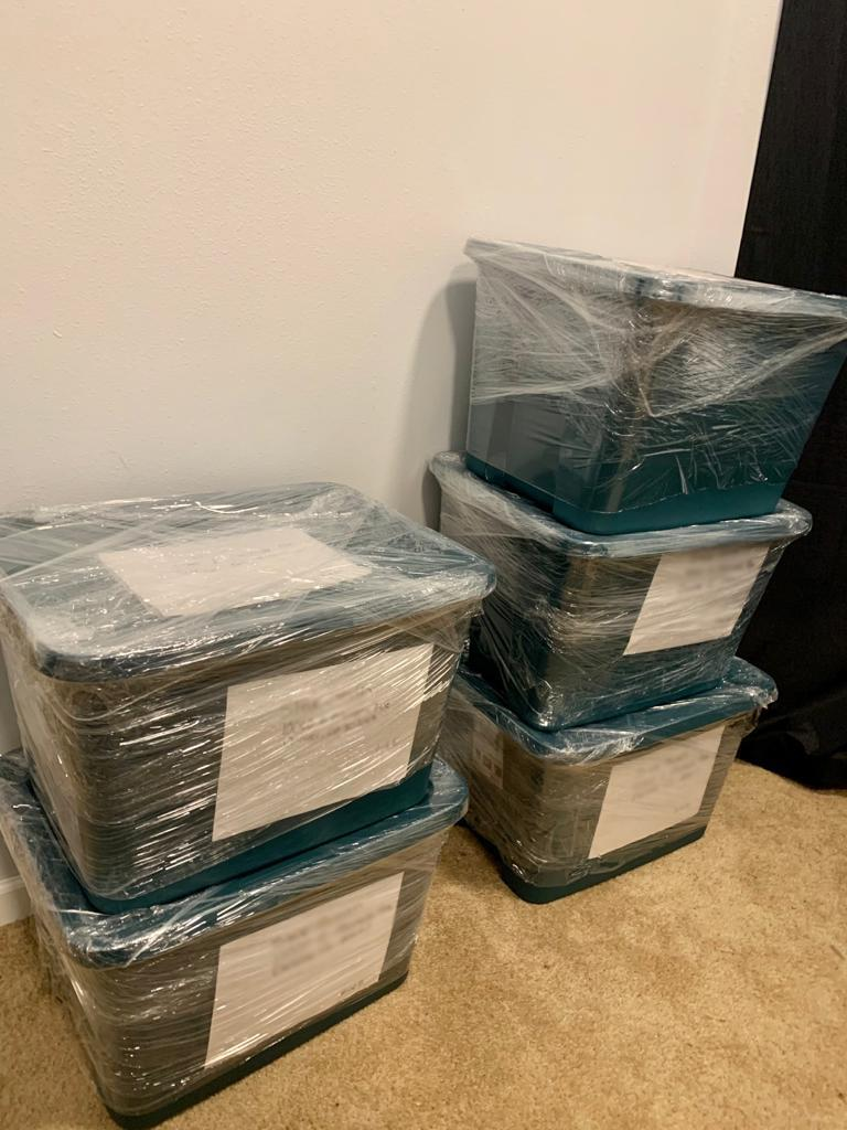 Full inventory: 9 27-gal plastic totes, 12 14-gal plastic totes, 4 medium cardboard boxes, 2 small boxes, 4 medium suitcases, 1 nightstand, 1 small dining table (disassembled), 1 clothes drying rack (folded), 1 wall hanging (flat in box) 1 desk (48”x30”), 1 office chair