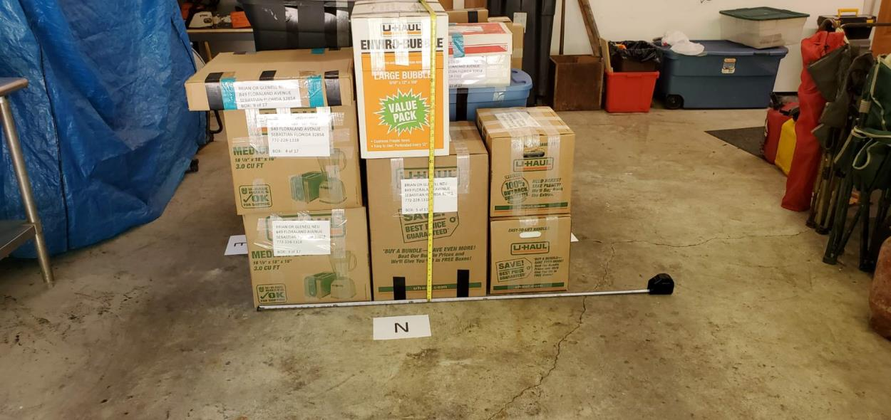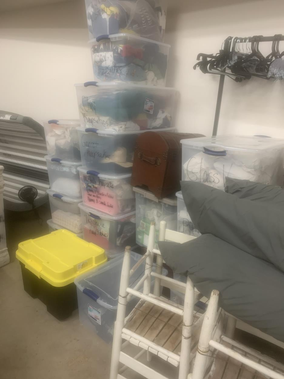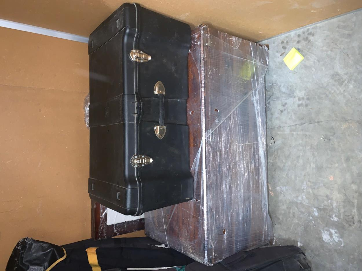 3 large tubs, wood chest, 50lb suitcase, 2 sizable picture frames, soccer equipment, XL duffel bag, 3 boxes, 8 bags of clothing, snowboard