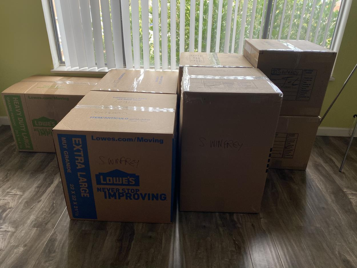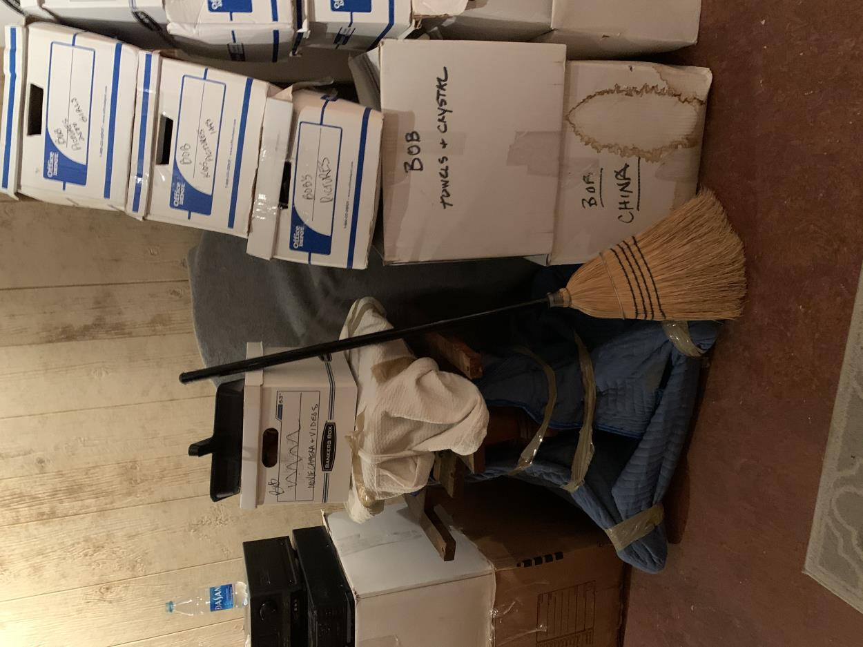 Packed and sitting in garage ready to go. Mainly clothing and cooking utensils. All three pictures are of the same pile of boxes (just different angles). Nothing particularly heavy or awkward.