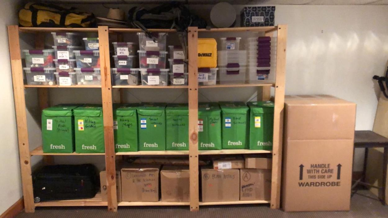 see picture -- everything on that picture, the shelf itself can be taken apart into sections. In addition to what's shown here, 5 more medium boxes (same medium size as bottom row) + 1 SUITCASE (UPDATED). boxes mostly contain books. the big one on the right contains clothes.
