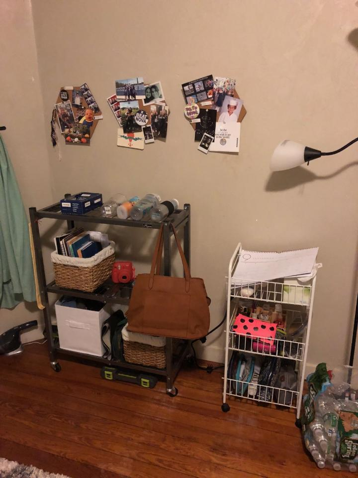Studio (0 bedrooms). No large furniture (no bed, no couch, etc.). Only furniture is 2 fold-flat bookshelves, 1 folding futon mattress, 1 kitchen table that folds to a small file cabinet, 2 plastic file bins.