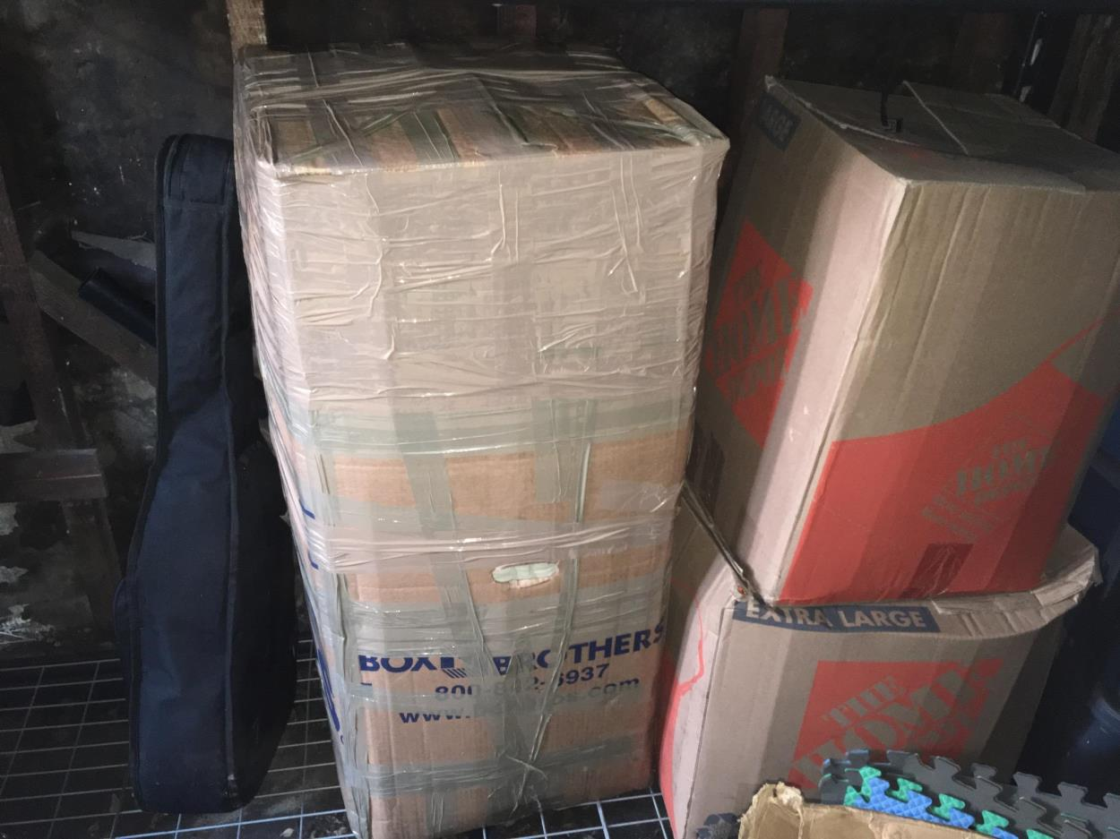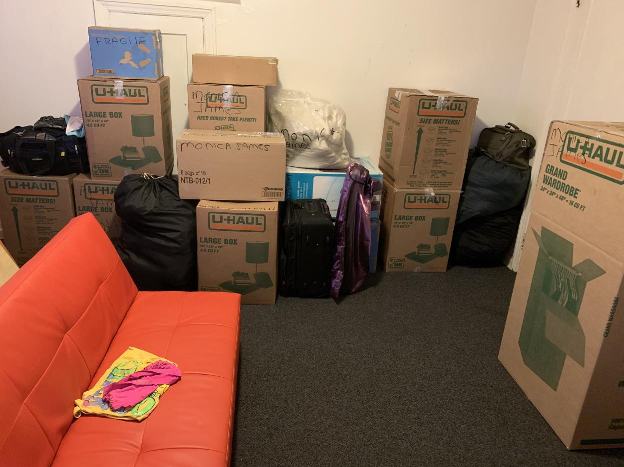 Boxes consist of clothes, shoes and kitchen items. Only furniture is the bed (headboard/frame, mattress set) and tv.