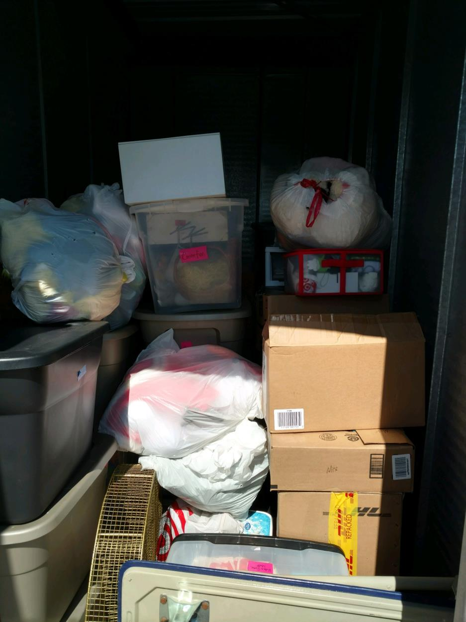 Several plastic tote style bins, no loose items, possibly one small wooden chair and a wooden shelf.