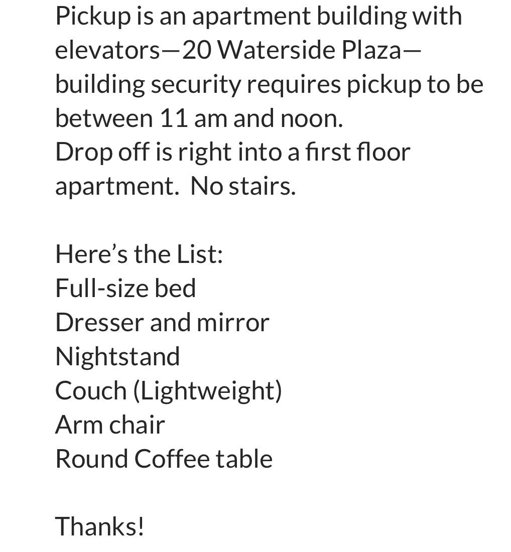 The items need to be picked up June 27, 28, or 29. I will be available to help load the truck. The items need to be delivered to a storage facility no later than July 1st, 2nd or 3rd.