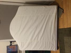 Full-sized bed including mattress and box spring.