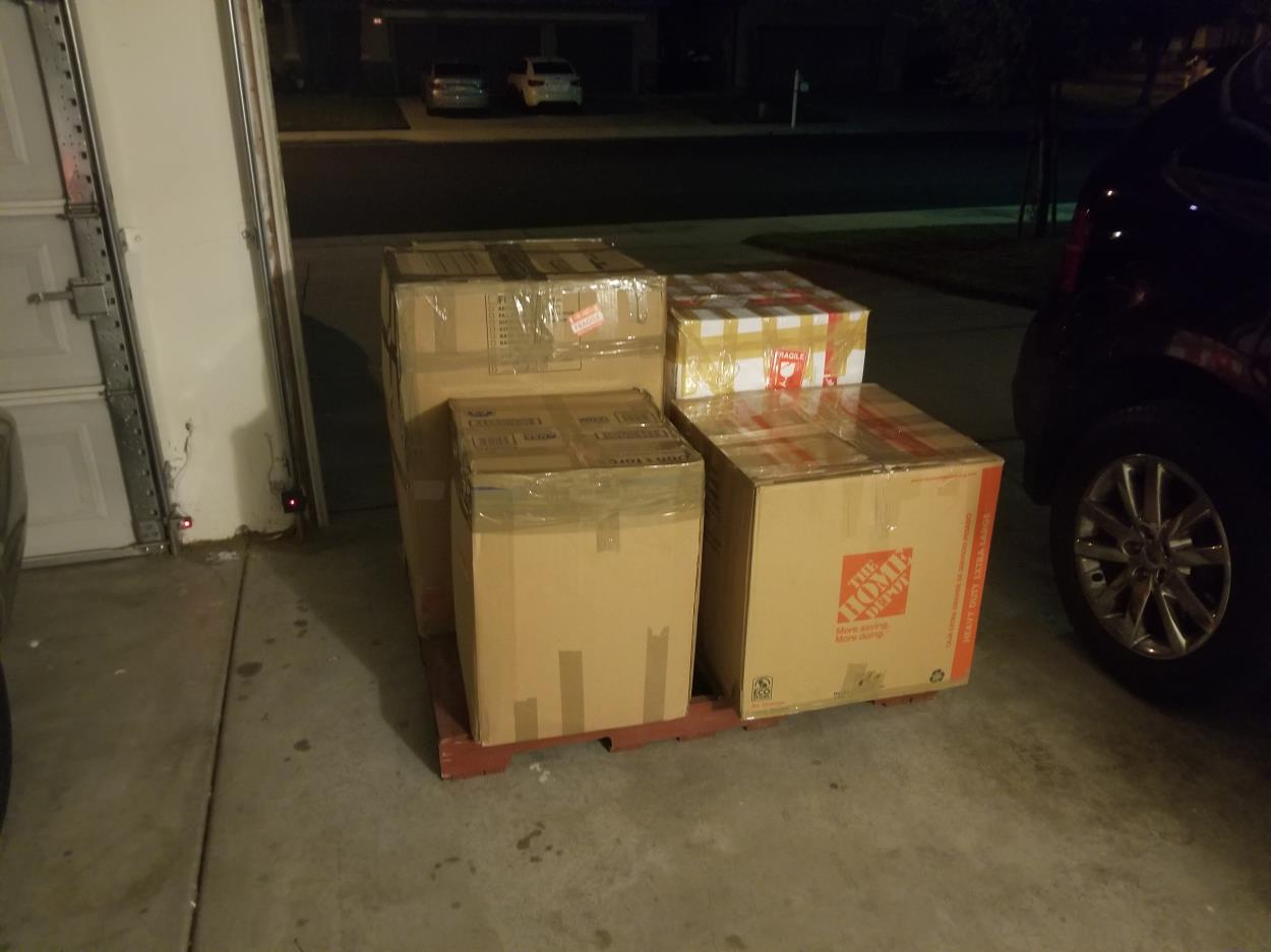 Four boxes wrapped and put on a ballet ready for a pickup from a garage and delivered