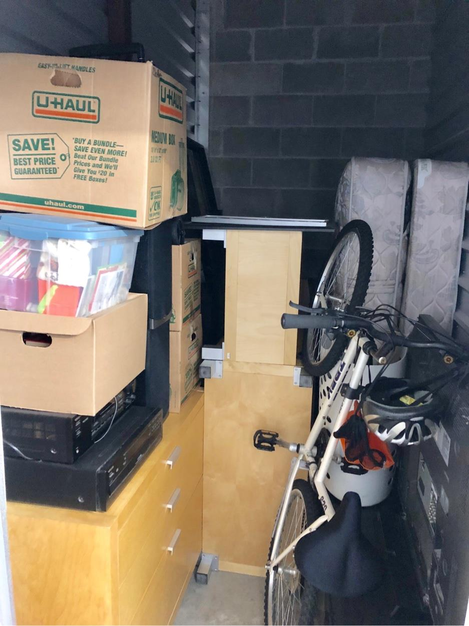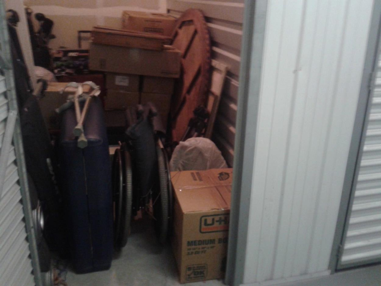 The storage is loosely filed with a myan calendar (53") a small single adjustable bed w/mattress (35"W x 96"L x 10"D) a portable massage table (30"x36") Along with boxes and some other small maliciousness items like duffel bags, pictures, dart Board things like that.
