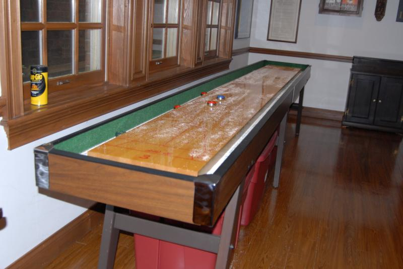 (1) American International Shuffleboard table; 14' long x 24.25" wide x 5.5" tall. 3 legs are 22.5" wide, 27.5" tall & 5" thick. Weight 275-300 lbs