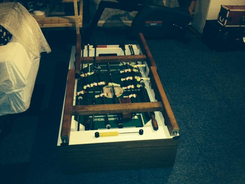 Old foosball table with glass surface; legs are off the table for shipping. Needs to be packed for shipping.