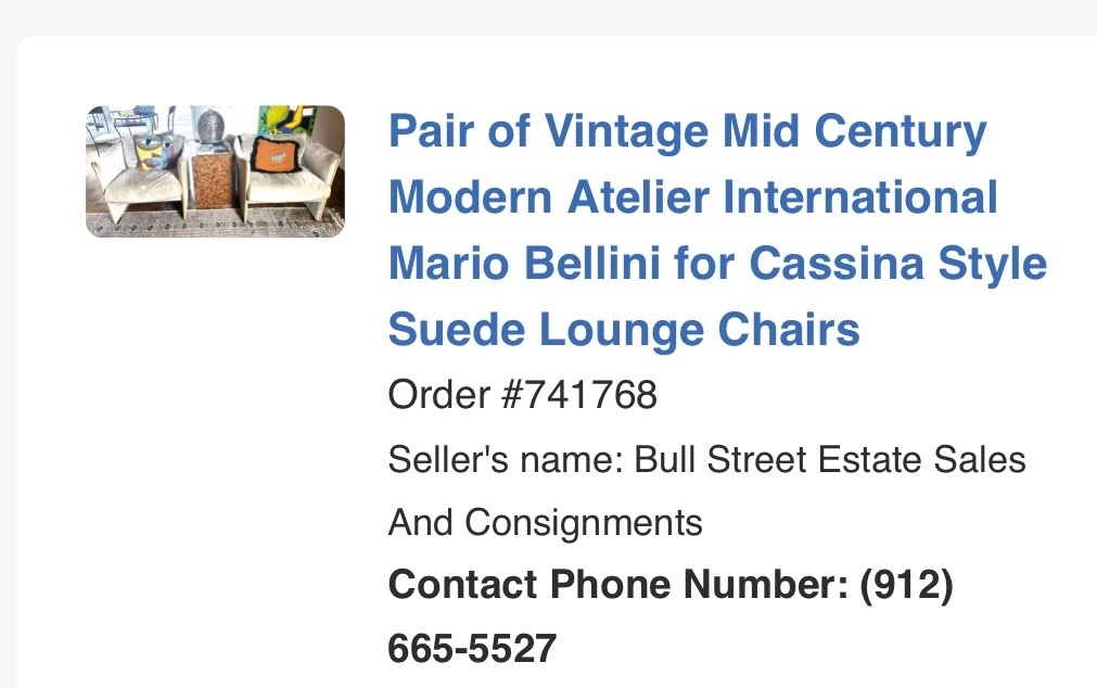 These items are auction items from an estate sale in Savannah Georgia. Order number for chairs #741768 which is in picture. Order number for sofa is #741769.
