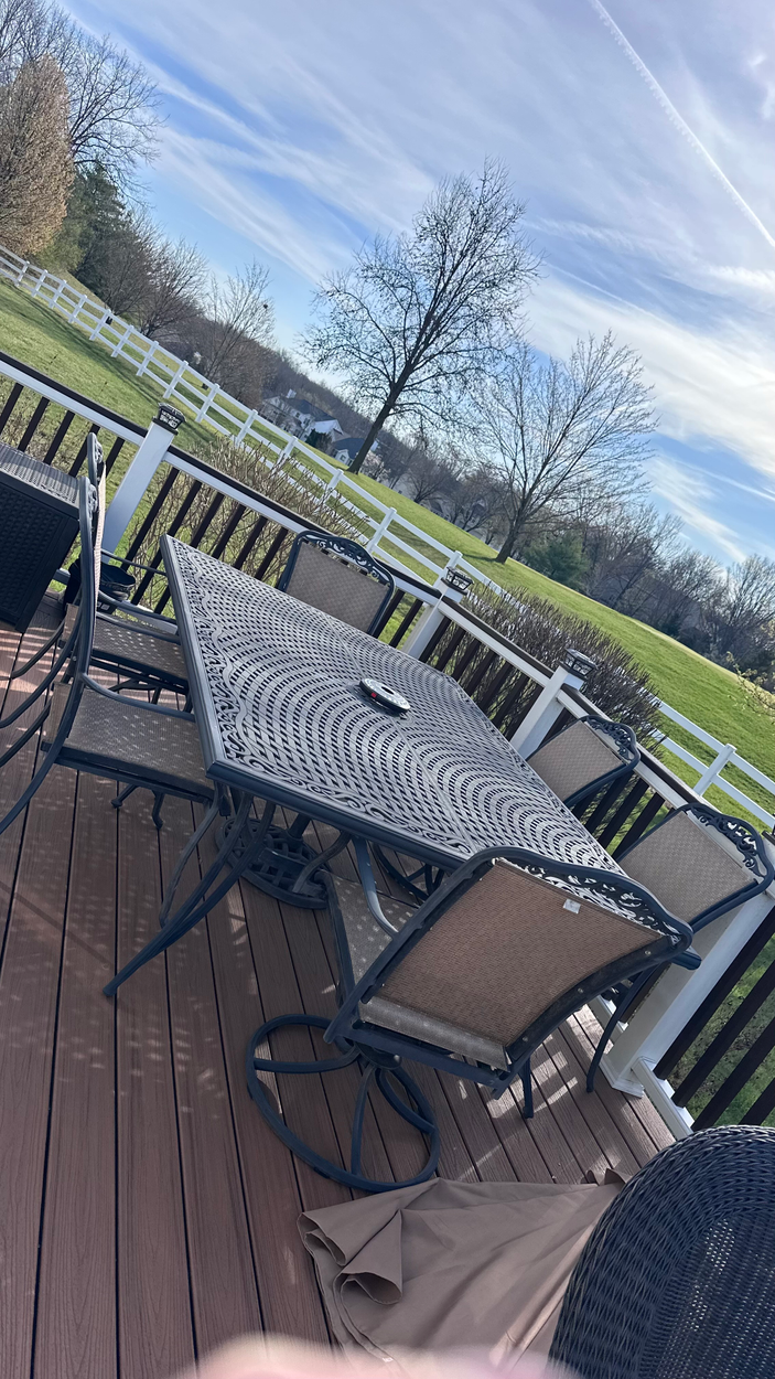 Patio table with 10 chairs. Item is in backyard.