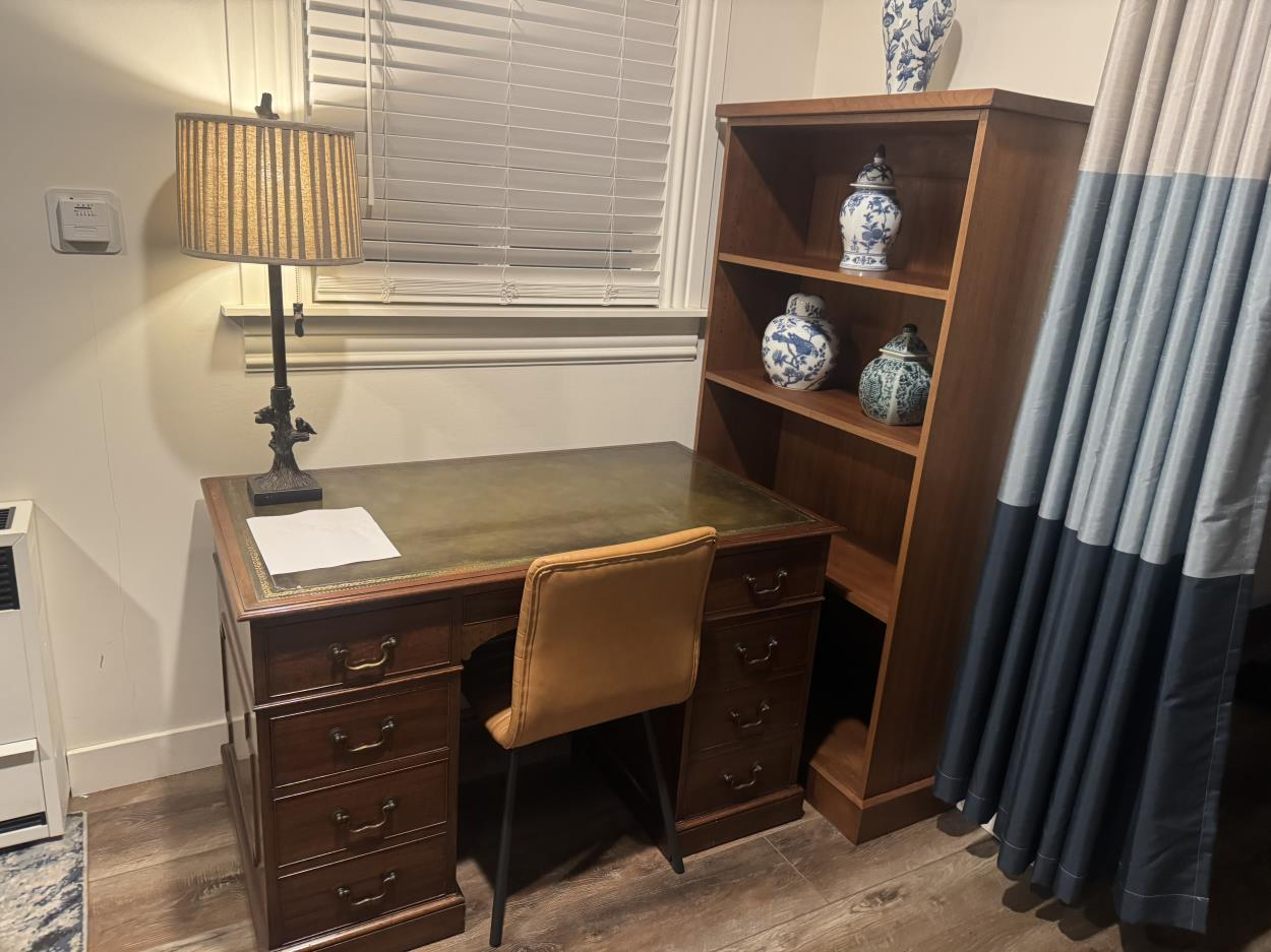 There are 3 steps up to the front porch where the front door is. The desk separates into top + 2 drawer bases. The top is a leather writing surface so must be fully protected. It is solid wood with brass drawer handles. Nothing can be stacked on desk top. All items exactly shown in photos. I am flexible on delivery & pickup. Happy to fit into an existing route.