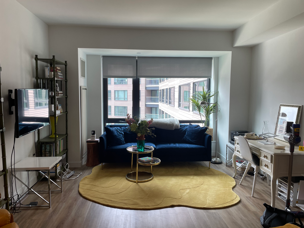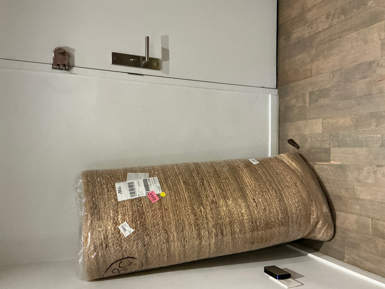 Pickup is a 24hr Doorman Building. Pickup can be anytime. Drop off can be at the condo door or garage (which is closer). Both weather protected. Rug in original shipping wrapping .